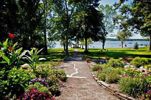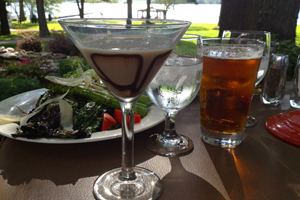 Just off the Banquet Room is a quiet nook in the lodge called the Greenhouse Room. With tile floors, wrought iron café tables, a private bar and beautiful plants, this room brings the outdoors indoors and is a wonderful area for private gatherings with fewer than twenty guests. Down the hall, the Old Bar Room is exactly what it sounds like. Once upon a time the room included a well-appointed bar. The bar has since been moved to just off the Main Dining Room, but the room is now a cozy dining area with an original fireplace made of stones from around the world that Townsend collected from friends and family. The Main Dining Room and Bar Room offer beautiful scenery of the lake and gardens. Once a porch of the original house, the recently remodeled bar and lounge offer a pub style menu in an intimate atmosphere featuring a second original stone fireplace. The patio just outside the Dining Room seats customers wanting to enjoy spectacular sunsets and live music on weekends.