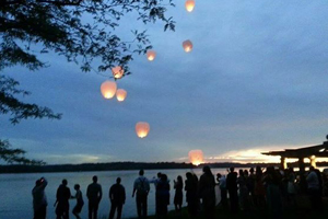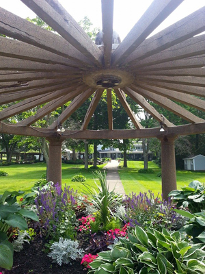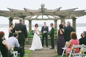 Outdoor ceremonies can be held at two places; the pagoda, which is on the water’s edge, or under the trellis near the lodge. The trellis is covered with beautiful lavender wisteria and ivy during the warm months and is surrounded by the lodge’s lush gardens. The area is appropriate for smaller weddings of forty to forty-five guests. The pagoda is a beautiful covered structure at the lake. Weddings often take place here and the area can accommodate as many guests as the bride and groom wish to have. However, if the weather doesn’t cooperate only 200 guests can be moved indoors. Outdoor tents can be assembled for outdoor reception areas.