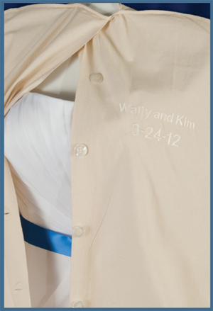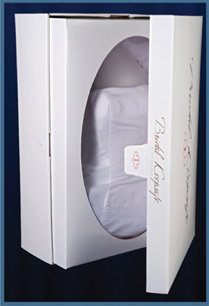 We package your dress in acid-free tissue paper that won't scorch your gown's fabric, and don't use plastic that can hold moisture. Your gown can be folded into a glamorous acid-free storage box and displayed or featured in your home. We can also hang your bridal dress and veil on an unbleached muslin hanger in a solvent-free natural cotton muslin bag.