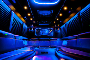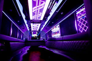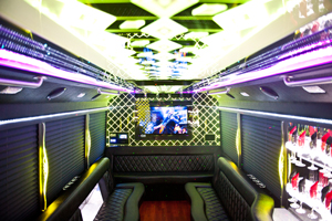 Our Driver is clad in a Tuxedo, the Red Carpet rolled out in front of your church or ceremony location next to a vat with a Complimentary Bottle of Bubbly on ice for the newlyweds. Champagne flutes, decorative napkins and ice are inside for your convenience. Once on board you will be dazzled by the Fiber Optic & Laser Lights, Large Screen TV and Full Stereo Options.