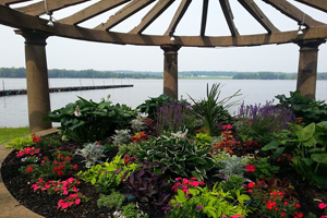 Outdoor ceremonies can be held at two places; the pagoda, which is on the water’s edge, or under the trellis near the lodge. The trellis is covered with beautiful lavender wisteria and ivy during the warm months and is surrounded by the lodge’s lush gardens. The area is appropriate for smaller weddings of forty to forty-five guests. The pagoda is a beautiful covered structure at the lake. Weddings often take place here and the area can accommodate as many guests as the bride and groom wish to have. However, if the weather doesn’t cooperate only 200 guests can be moved indoors. Outdoor tents can be assembled for outdoor reception areas.