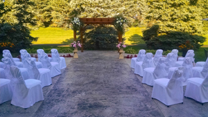 The Cedars Patio, is surrounded by evergreens and gardens and is centered with a quaint pergola that is ideal for taking vows, a string quartet, or setting up a bar. The patio offers a fantastic venue for alfresco parties. A canopy of strung white lights adds to the romantic and festive feel.